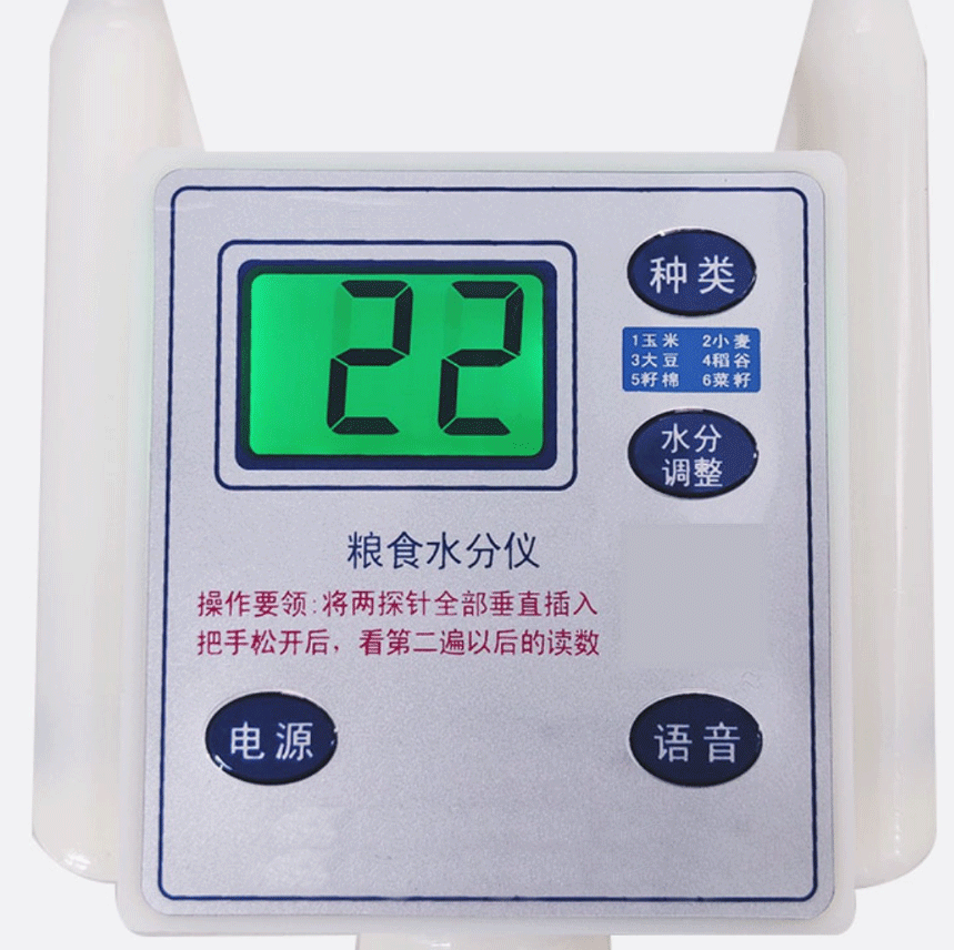 電源:按住該鍵一秒鐘開機(jī)或者關(guān)機(jī)。種類:按住該鍵不松手,將循環(huán)改變測量品種。水分調(diào)整:按住該鍵不松手,可將顯示的結(jié)果上調(diào)或者下調(diào)語音:按住該鍵不松手,可循環(huán)改變語音播報方式
